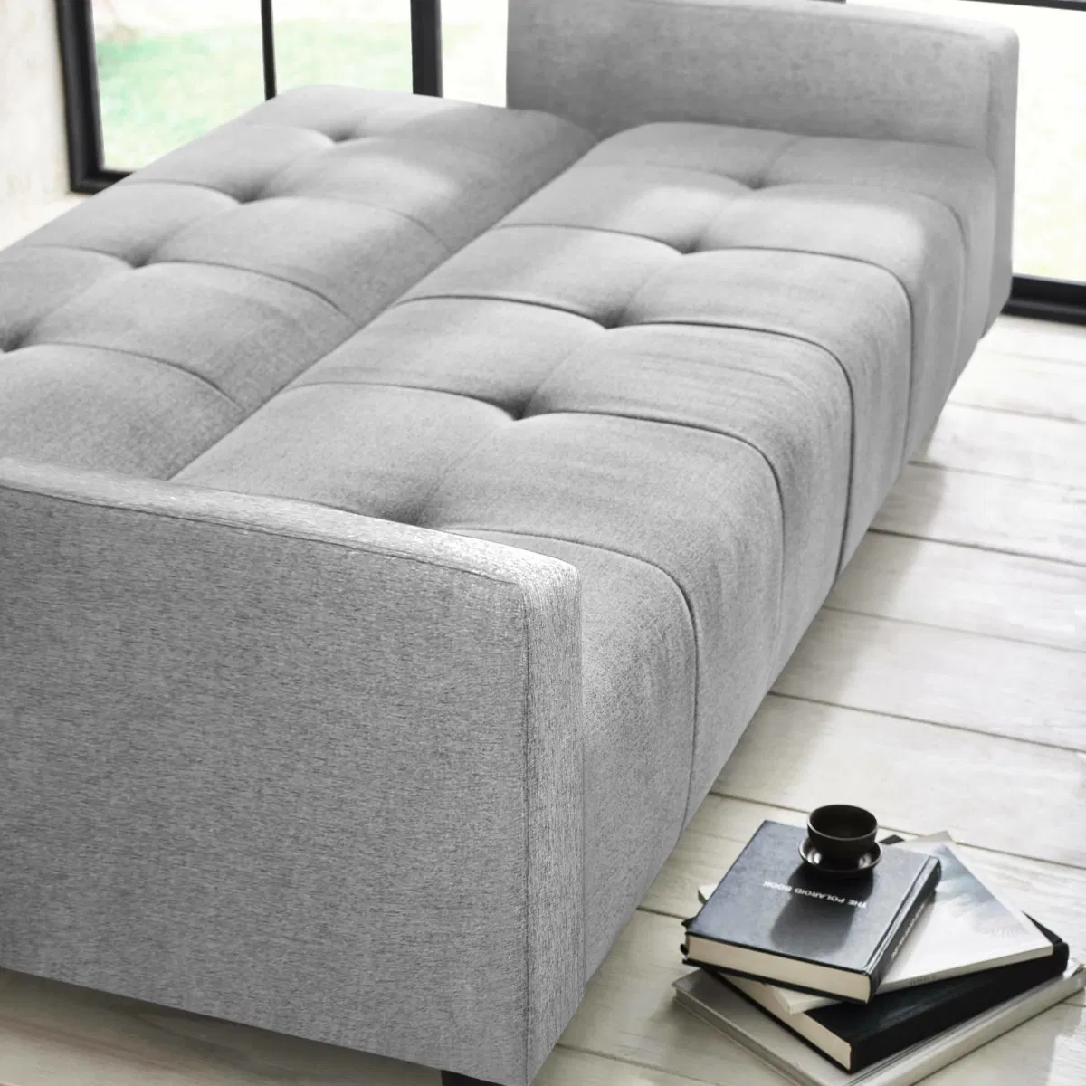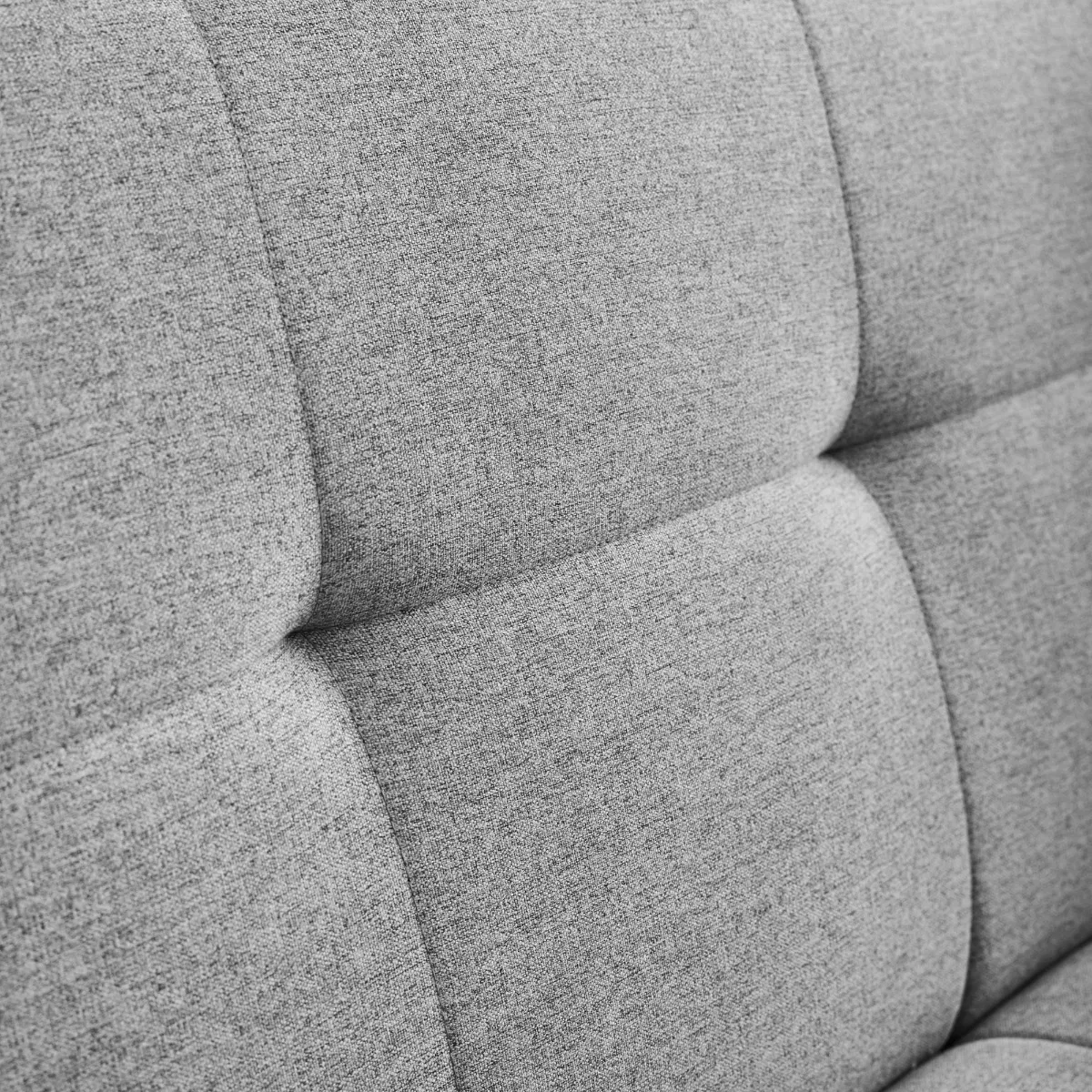 - Upholstered in light grey textured fabric.