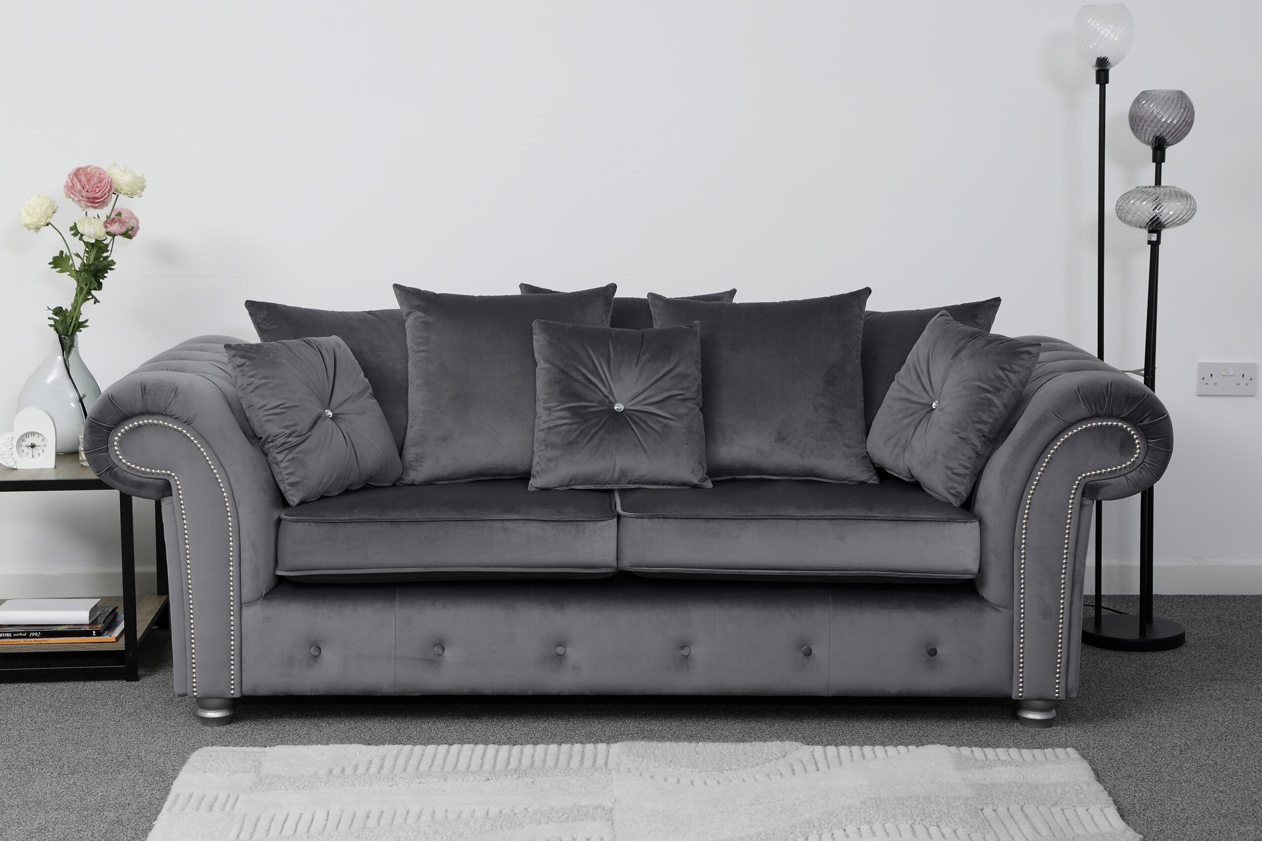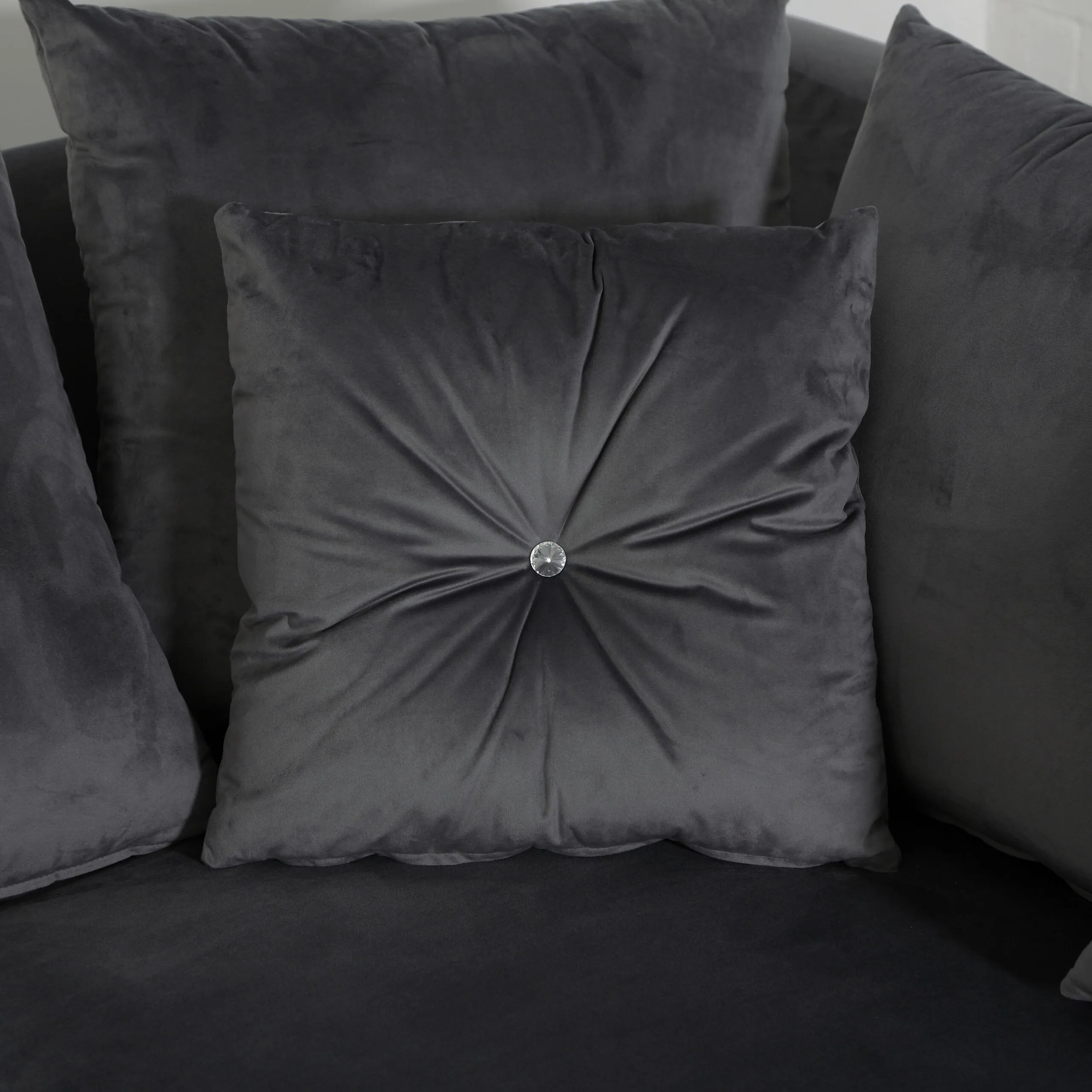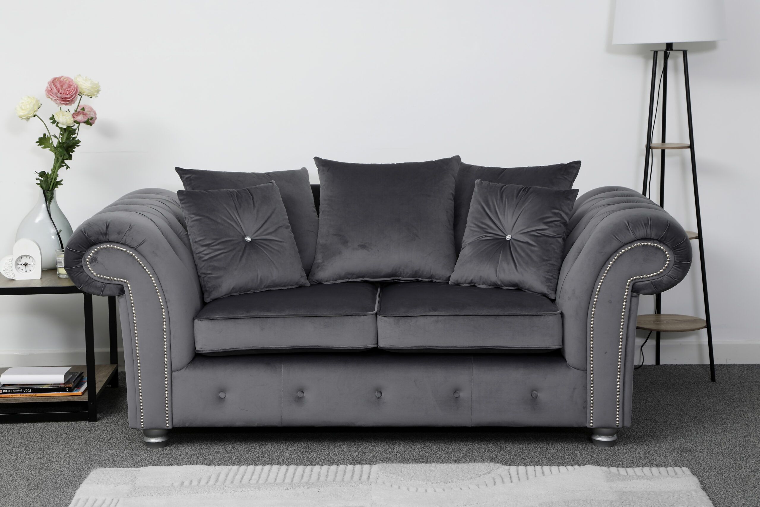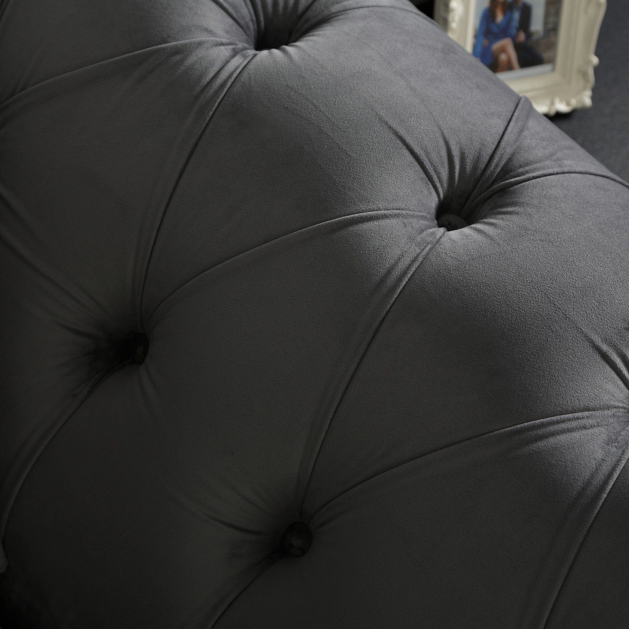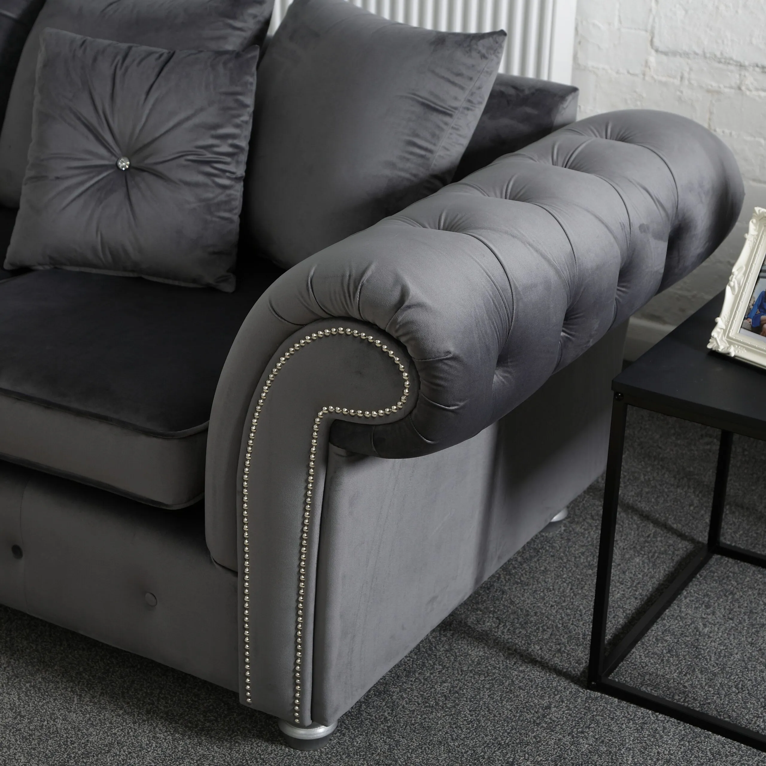 The light grey velvet is soft and luxurious, and the studded accents add a touch of sophistication.