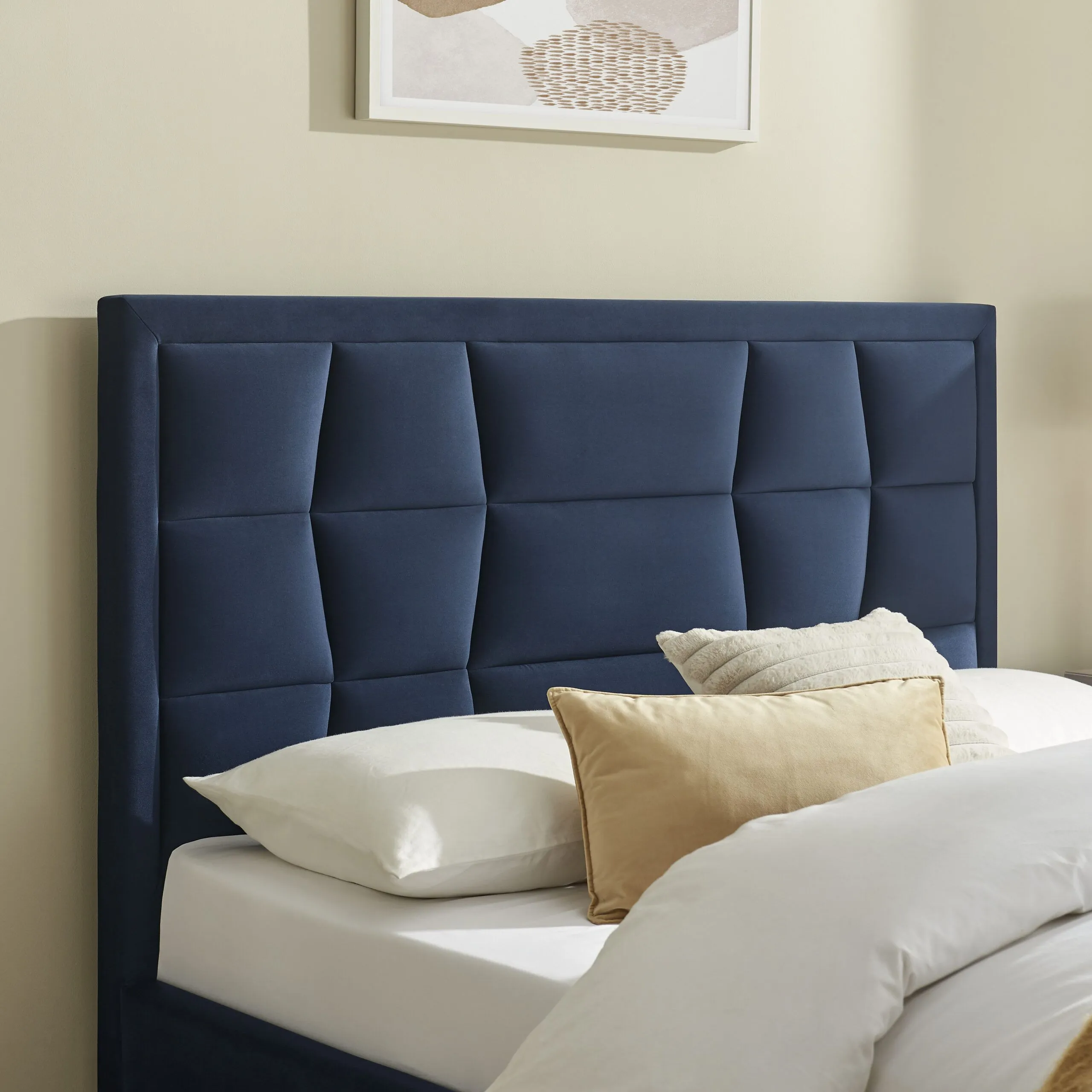 A standout feature is the beautifully padded headboard with a geometric design, adding texture and visual interest while providing a comfortable backrest for relaxing, reading, or watching TV in bed. Its clean lines and sophisticated finish make it a versatile choice for both minimalist and statement interiors. What truly sets this bed apart is its eco-conscious construction. The velvet upholstery is made from 100% recycled low carbon fabric, allowing you to enjoy premium style while making a more sustainable choice for your home.