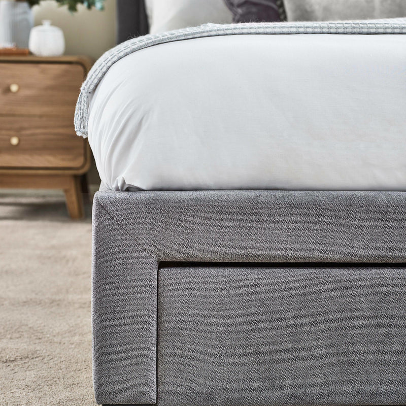 Indulge in luxurious style and functionality with this 135cm grey 4 drawer bed. Beautifully crafted with a sleek grey upholstered frame, it features a refined headboard outline that adds a sophisticated touch to your bedroom. The plush, padded headboard ensures ultimate comfort, while the four spacious under-bed drawers offer discreet storage to keep your space organised. Blending modern elegance with practical convenience, it effortlessly enhances your room. With minimal assembly required, you can effortlessly transform your space into a lavish retreat. Mattress sold separately.
