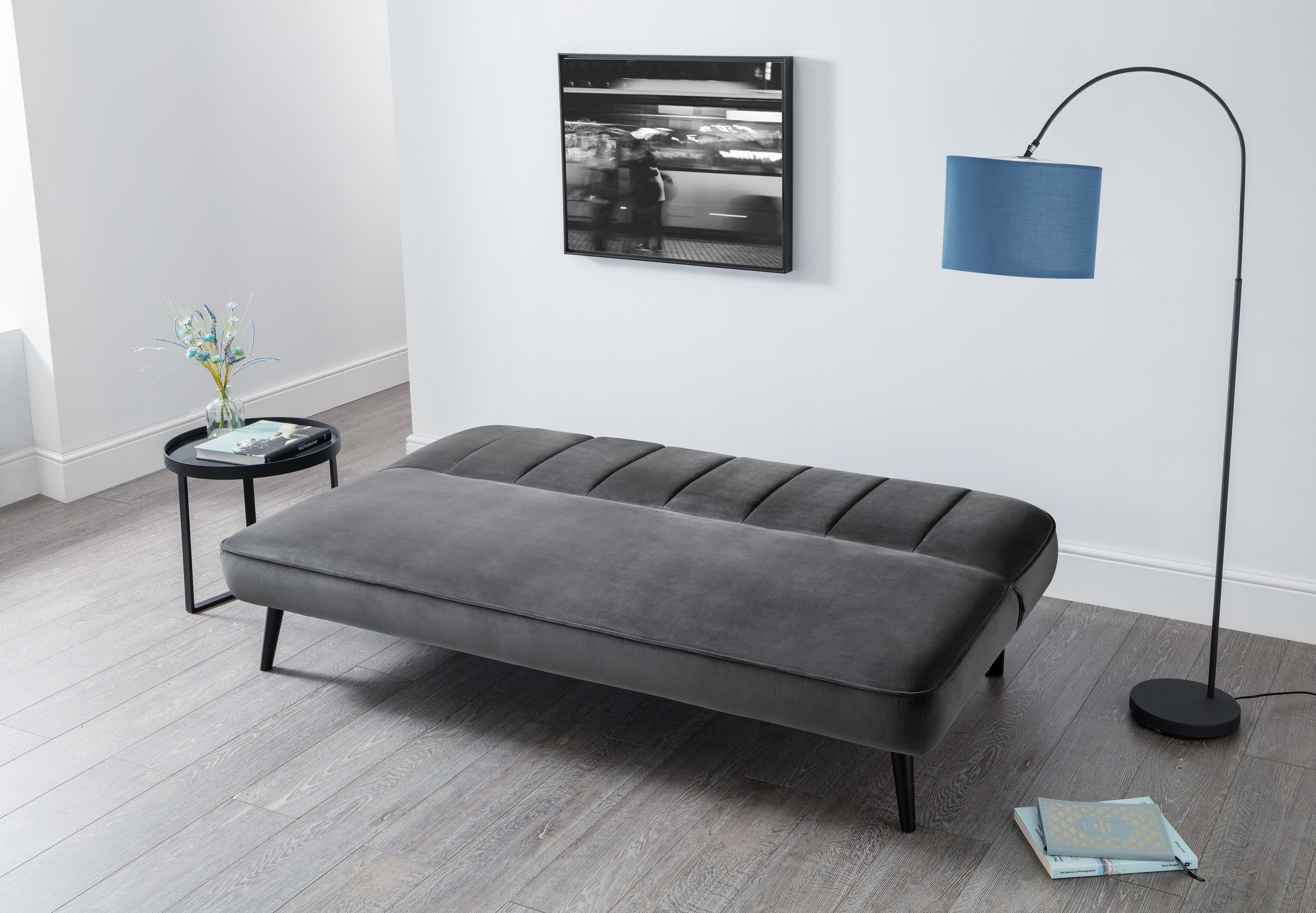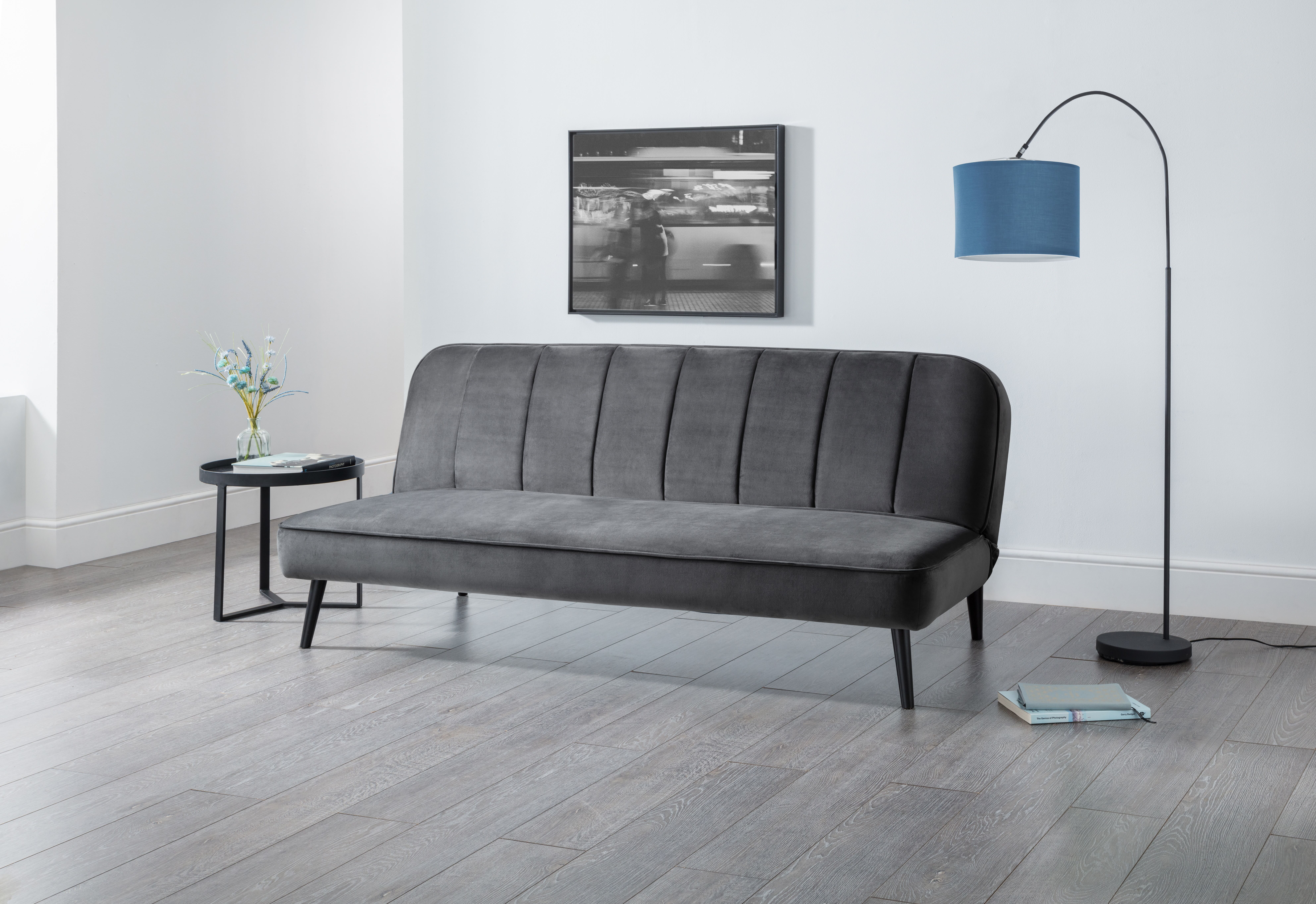 This minimalist, retro-inspired sofabed is compact and functional with an easy click-clack design. Upholstered in a luxurious grey velvet, featuring a beautiful curved back and scallop detailing with tapered black legs, this sofabed will suit a range of modern interiors.