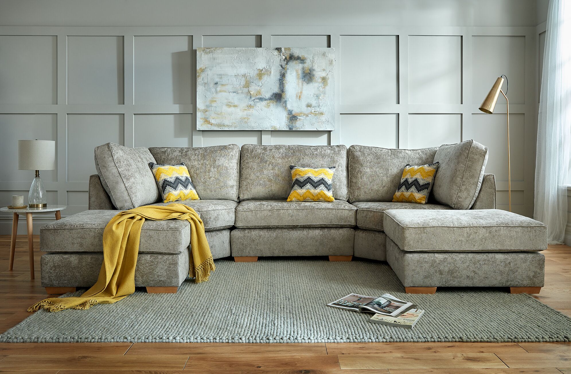 • Sofa in Truffle Fabric with Mustard Pattern Scatter Cushions