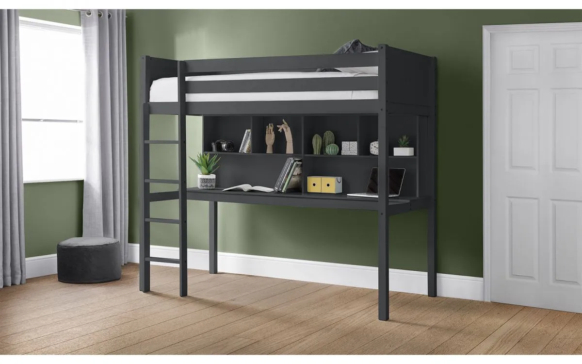 Crafted from Malaysian Hardwood and MDF, the Titan High sleeper is finished in a choice of colours, matching with any bedroom décor as they grow. Offering a classic design with panelled detailing, this high sleeper features a workstation underneath, complete with shelves and room beneath for extra storage.